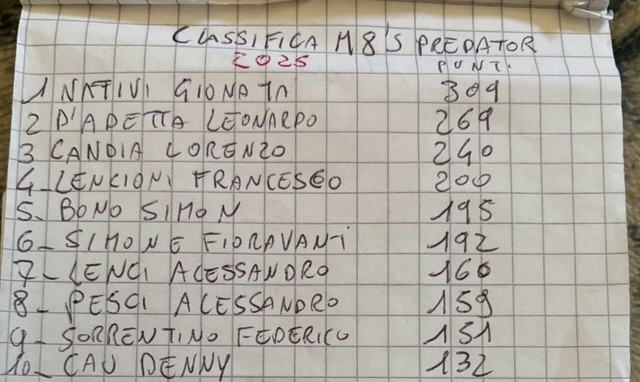 Domenica 7settembre presso i laghi Malvaldo si è tenuta la "m8 predator cup", competizione di pesca ai predatori e non solo, dove a prendere il via eravamo in 35 agonisti con classifiche speciali per biodiversità di catture, classifica junior, ecc... Ogni pesce aveva una misura minima e una punteggiatura sua oltre alla lunghezza che determinata la classifica generale.