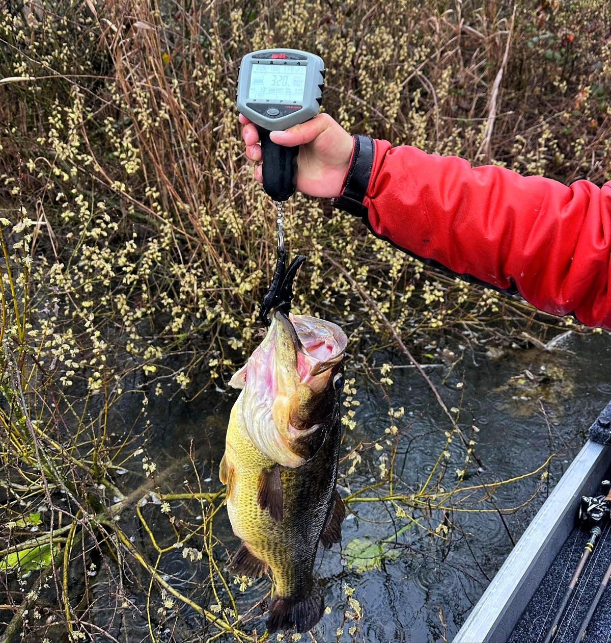 Continuo a lanciare ancora più fiducioso di prima, ma dopo qualche ora catturo solo un luccio... Ormai iniziavano ad allungarsi le ombre e la pescata stava volgendo al termine. Proprio sugli ultimi lanci, ormai con le mani congelate dalla pioggia e dalla temperatura rigida, sento sulla mia Bushadder una mangiata decisa sul Jig che mi fa riscaldare l'animo: ferro deciso e la canna si inchioda. Quasi stentavo a credere fosse un bass, talmente risultava pesante puntando il fondo e cercando di rimanere lì dove aveva mangiato l' esca; ma poco dopo ha fatto un salto fuori dall' acqua e lì mi sono reso conto di avere visto il bass più grande fino ad ora. La tensione per la paura di perderlo era enorme, ma per fortuna era allamato bene e avevo un buon filo da 20lb con cui sono riuscito a salparlo senza troppi rischi. Una volta nel guadino, capisco subito che questo pesce avrebbe superato quella famigerata soglia!