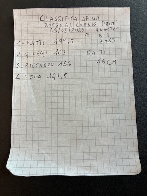 Nel rientro a Damiano viene l'idea di provare ad entrare in un chiaro e lì riusciamo a chiudere la quota con i 5 pesci per un totale di 163 centimetri, ci dirigiamo al punto di ritrovo di fine gara per vedere come ci siamo classificati; al termine finiamo al secondo posto contenti del risultato e pronti per altre competizioni... Stay tuned